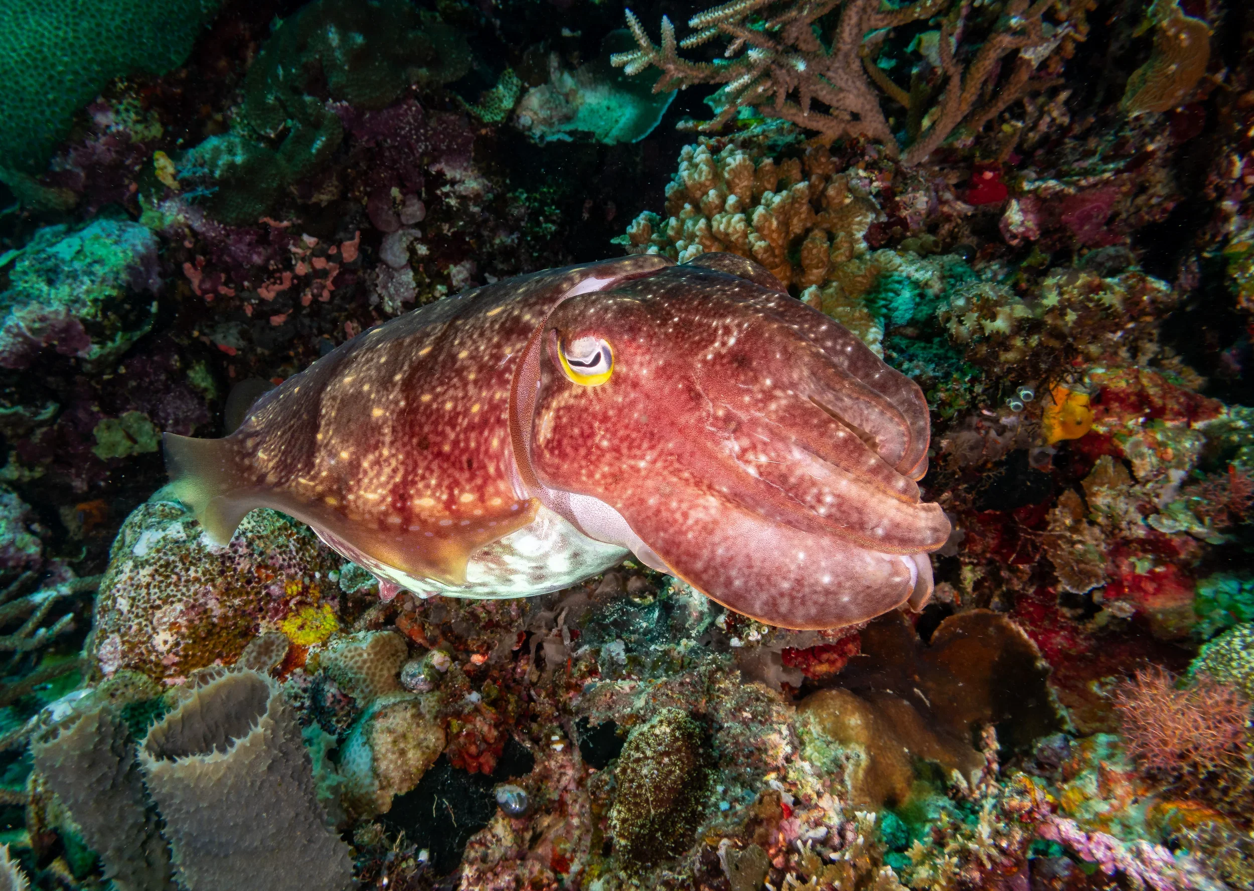 Night dives in Komodo are also an excellent opportunity to see cuttlefish. Their camouflage and hunting behavior become even more fascinating under torchlight.