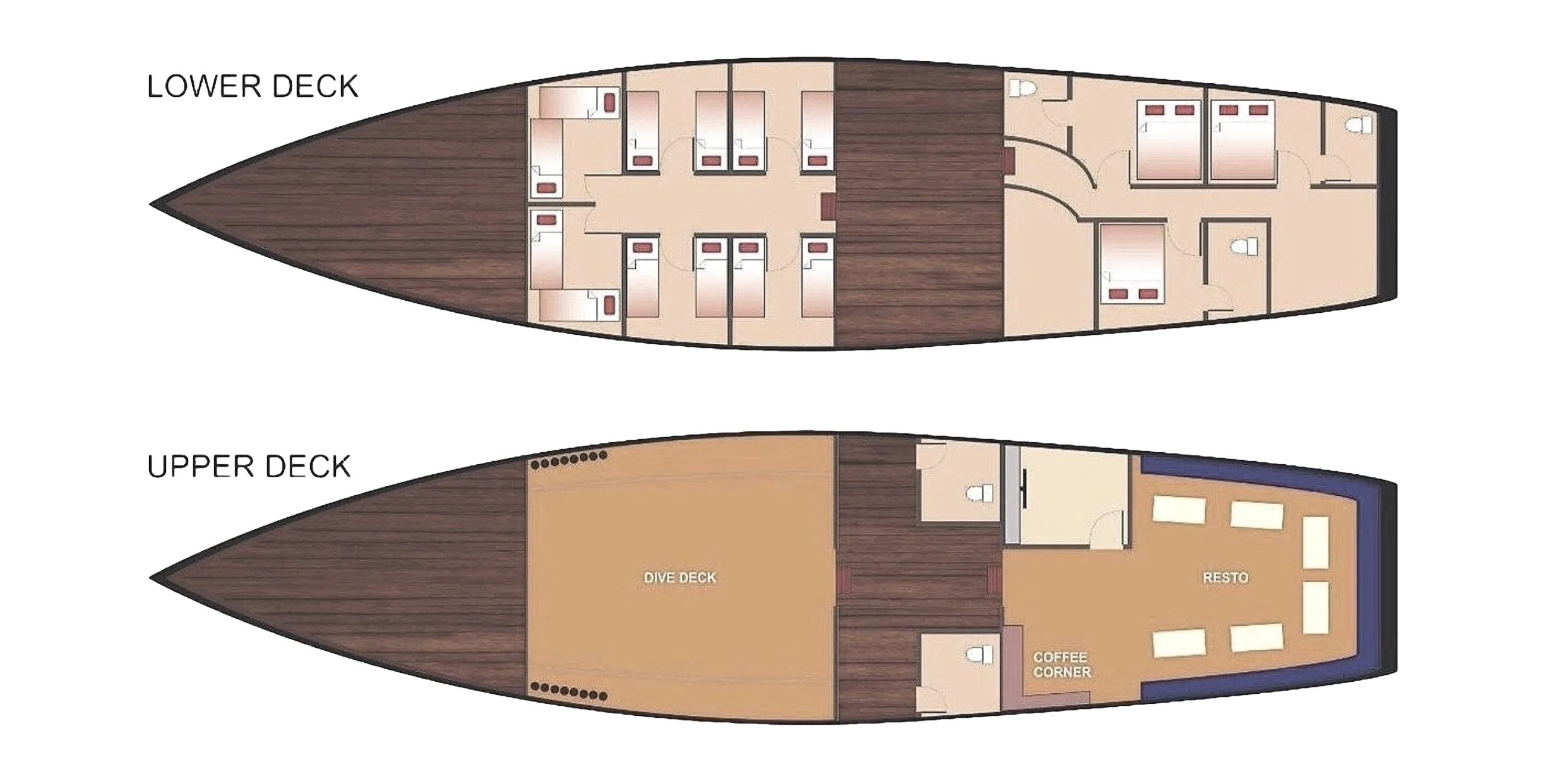 Below deck, 7 cabins can accommodate a total of 14 guests. The 4 twin cabins with two shared bathrooms and 3 double cabins with en-suite bathrooms are each equipped with an AC unit to keep you refreshed and power sockets for charging. All bathrooms provide freshwater showers, shampoo, and soap to keep up with basic hygiene.